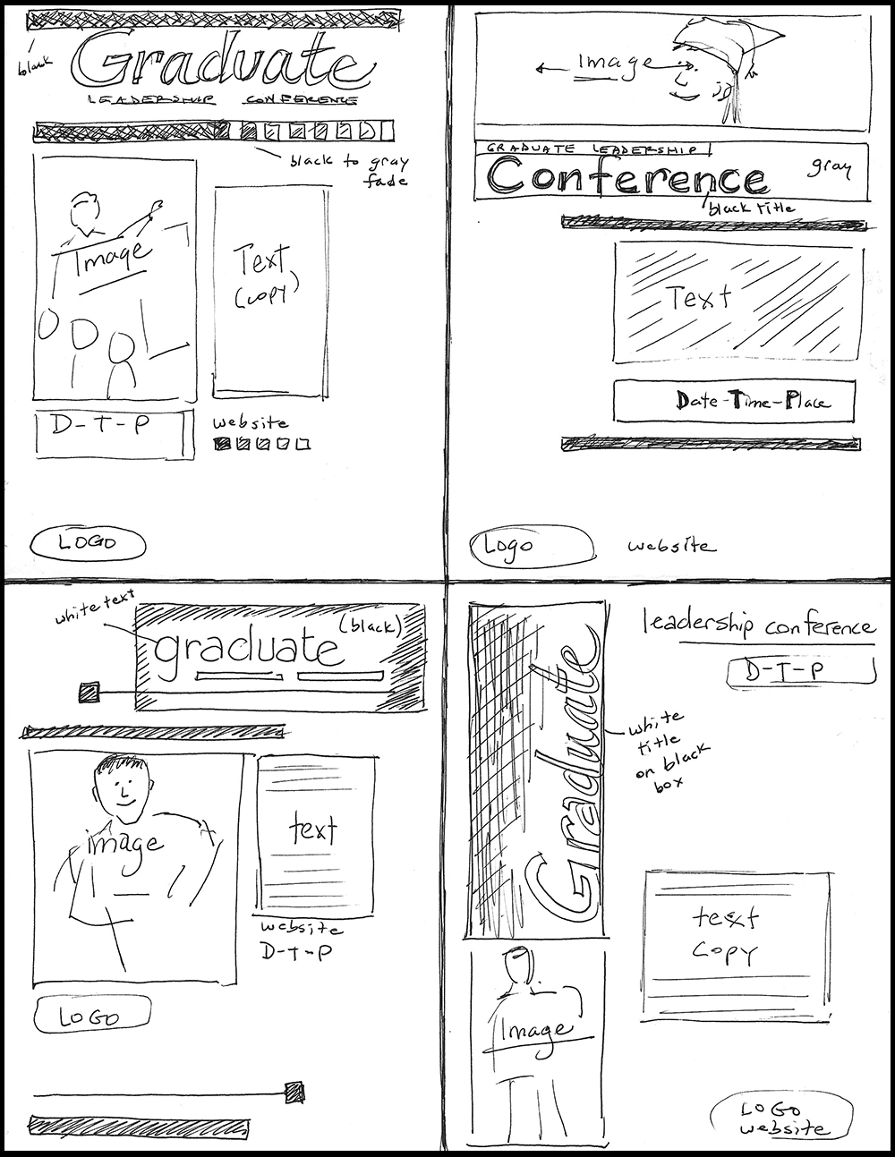1. SKETCHES: Fold a blank, unlined sheet of 8.5×11 paper in half lengthwise, then in the other direction. Use a pencil and sketch four possible layouts, one in each quadrant of your folded paper. Focus on the principles of design and typography as you sketch ideas for 5A Event Flier project. Include the following elements in your sketches: